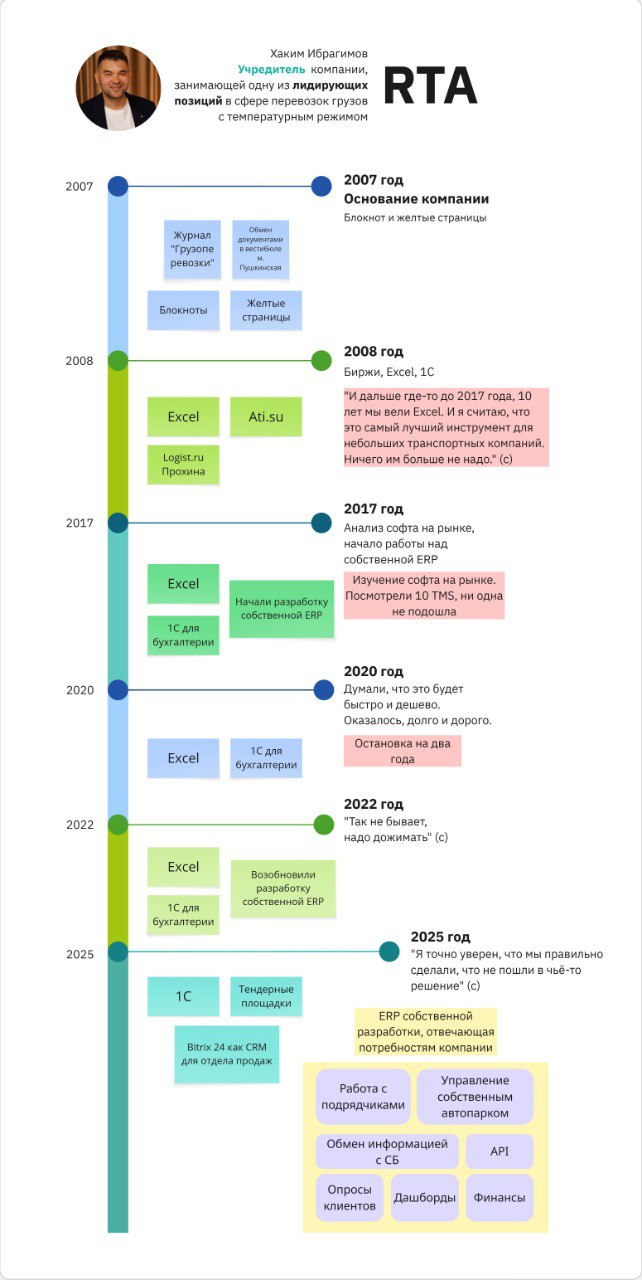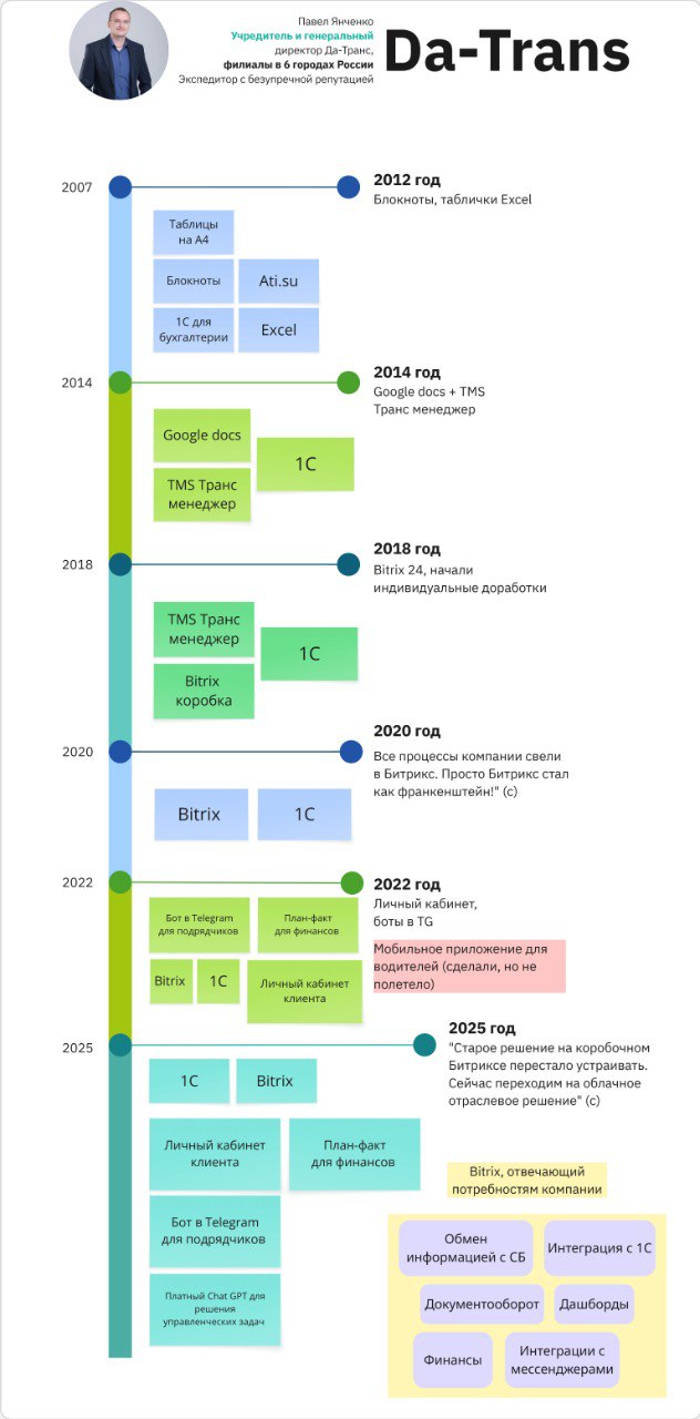 Компания была создана в 2007 году. Из Айти инфраструктуры тогда были: записные книжки; блокноты; журнал «Грузоперевозки», где искали клиентов и подрядчиков, а также документооборот, который вёлся не через ЭДО, а в вестибюле метро Пушкинская.